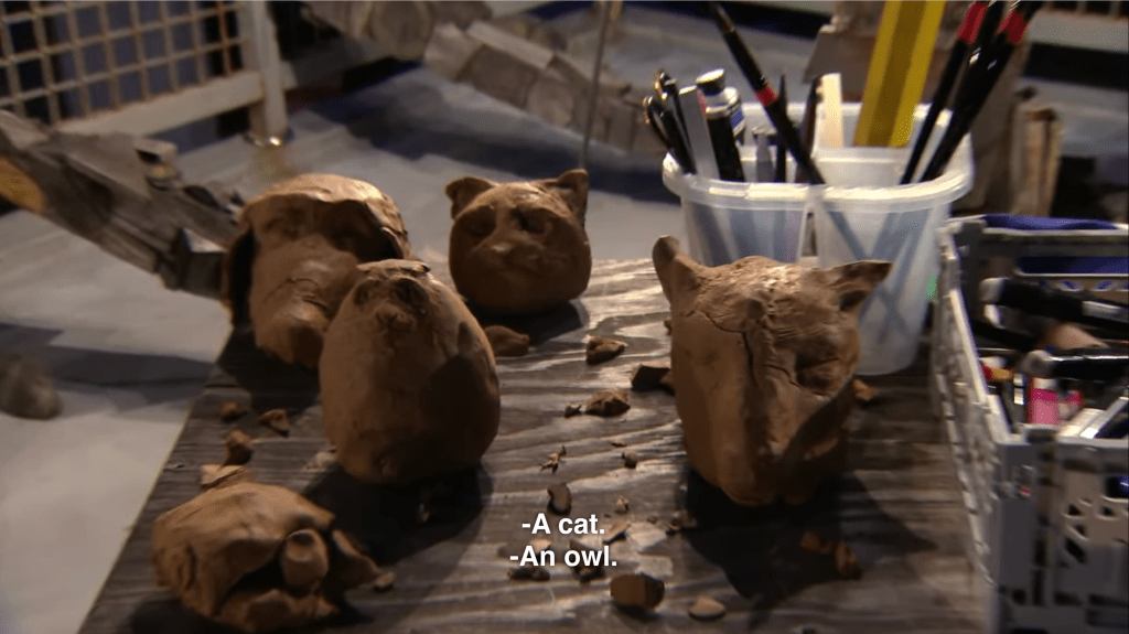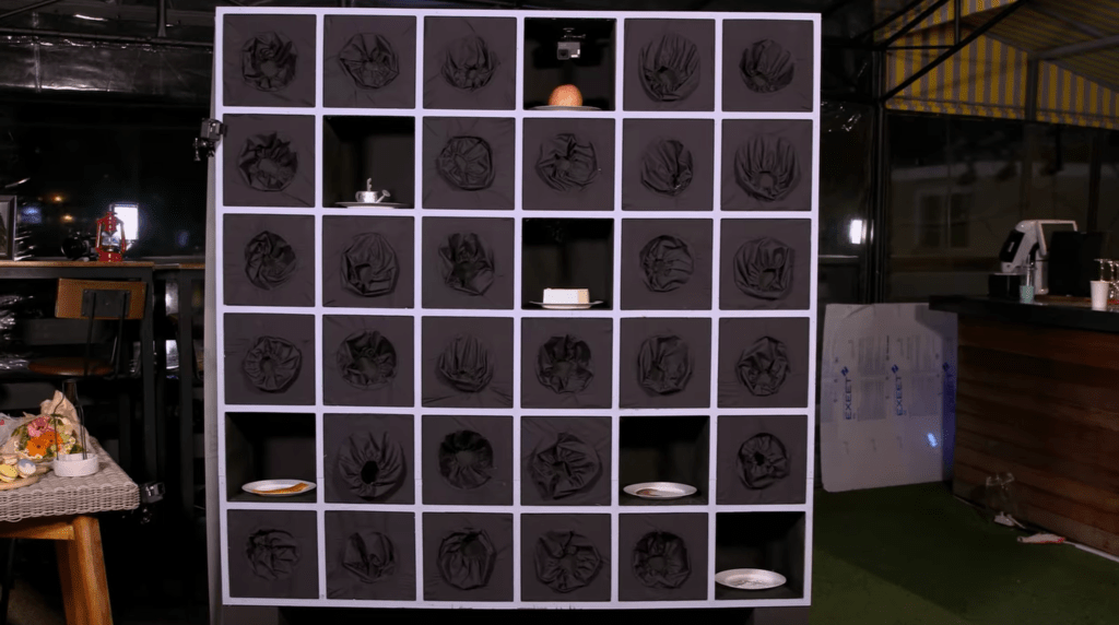 | “I touched something firm first. Then I touched something mushy to the left. Diagonally from something cold is something sticky. I was thinking of adding the slippery one in my painting, but went with what was between the sticky one and the slippery one instead.” | There is a wall of hidden objects that the teams have to feel without seeing. They have to make a grid of all of the objects and then find the one they need based on the artist’s descriptions. They can only take one item out of its box, so they have to choose correctly. | Red/wine colored beret |