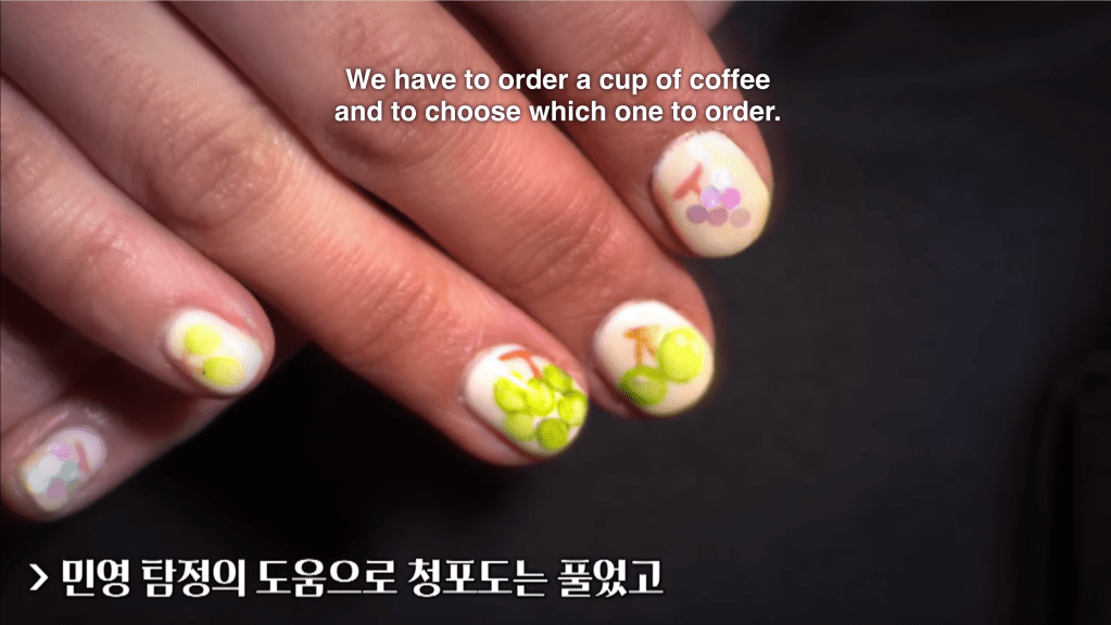 | “She has an unconventional appearance, and the drawing on her fingernails reminded me of my childhood days. [HSFFO HSBQF]” | HSFFO HSBQF is a code: if you shift one letter over, you get “GREEN GRAPE” in English. So they have to find a waitress with the matching nail art (they all have different fruits.) | Green grape nail art |