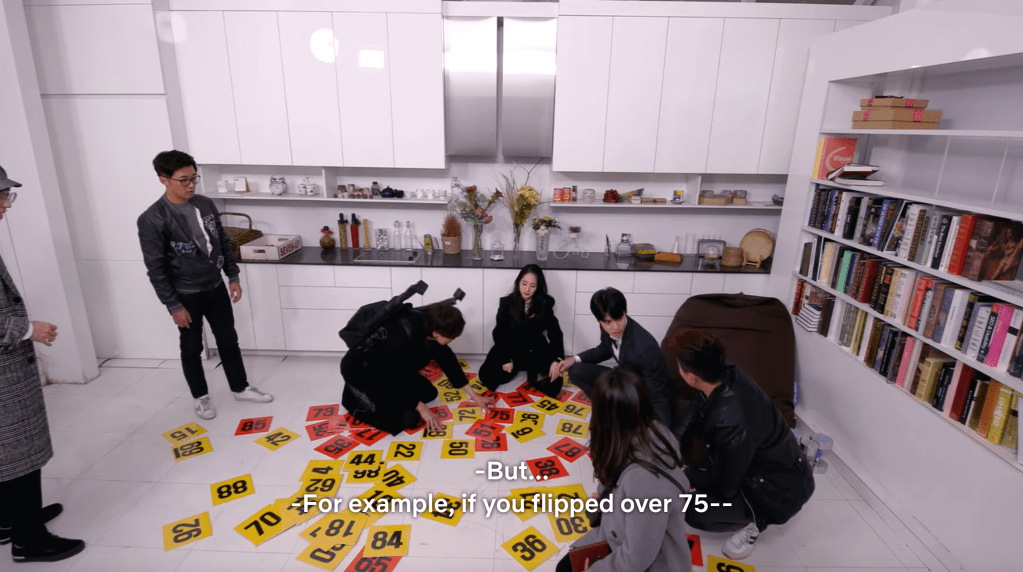 Once all the clues are gathered, the teams have to read the notebook again and figure out the location of their final destination: the first word/number/symbol of each passage creates an address. Arriving separately (Genius Team before K’s Team), they are directed into separate rooms but must take on the same challenges. The first involves a lot of math, since Cesar Elle Kim was also a mathematician. There are numbered tiles that are red on one side and yellow on the other. They have to follow the instructions and flip certain tiles: first even numbers, then multiples of three, then multiples of five. After all the steps are finished, the number of yellow tiles left provides the code to the next room. KAIST graduate and math genius Jaepyung solves this by doing calculations in his notebook and then directing his teammates, while K’s Team spends a lot of time fussing and infighting. But they both get it eventually.