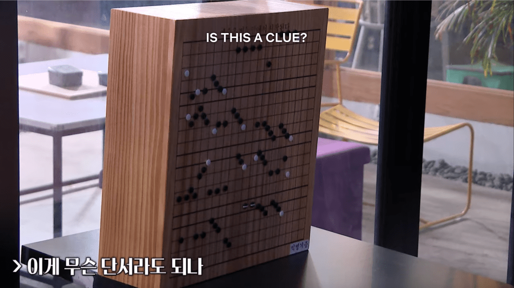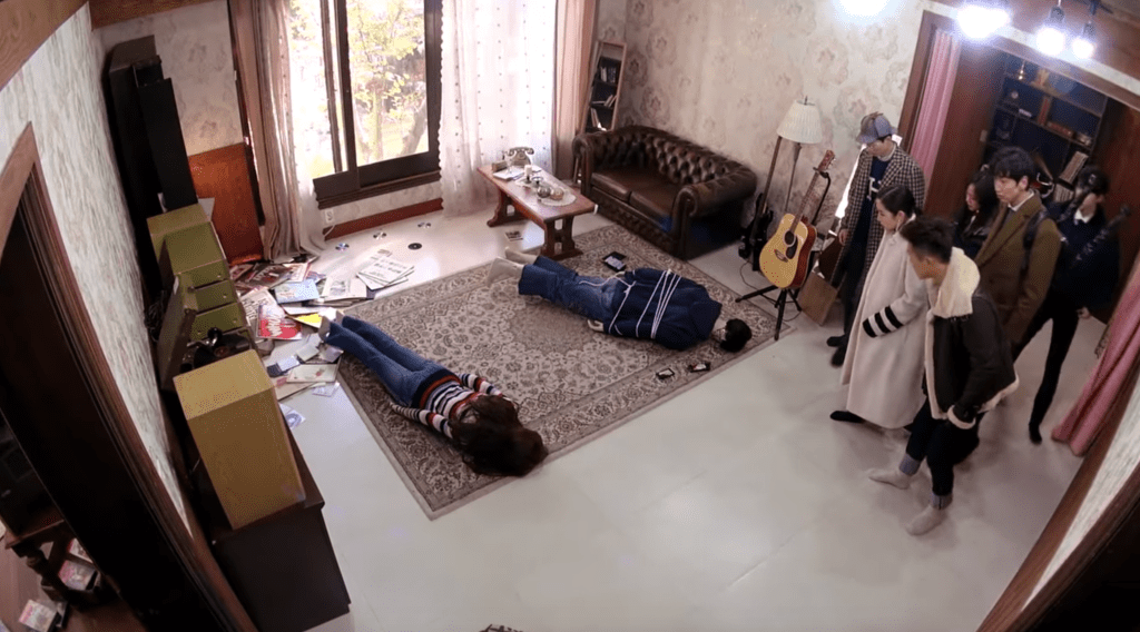 The team notices that the front lock is damaged. They surmise that the culprit came in through the front door, then locked it and broke it after the murder and escaped through the window. They have to figure out how the killer was able to lock the window after leaving. Sehun looks through a pile of CDs on the floor and finds one with a chip in it. He discovers that he can use it to unlock the window lock – plus it’s thin enough to slide back through the window afterwards. Of course, Kwangsoo the betrayer ends up stealing Sehun’s. answer while he’s busy testing the lock, and he wins the money instead. Sehun doesn’t actually say anything about it, but you can just tell he’s a little salty.