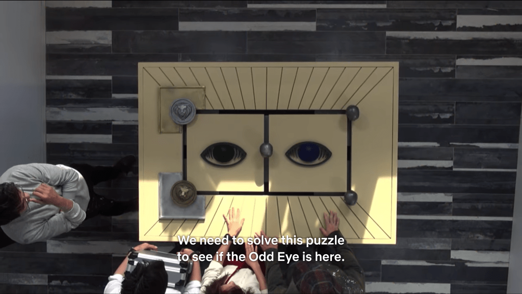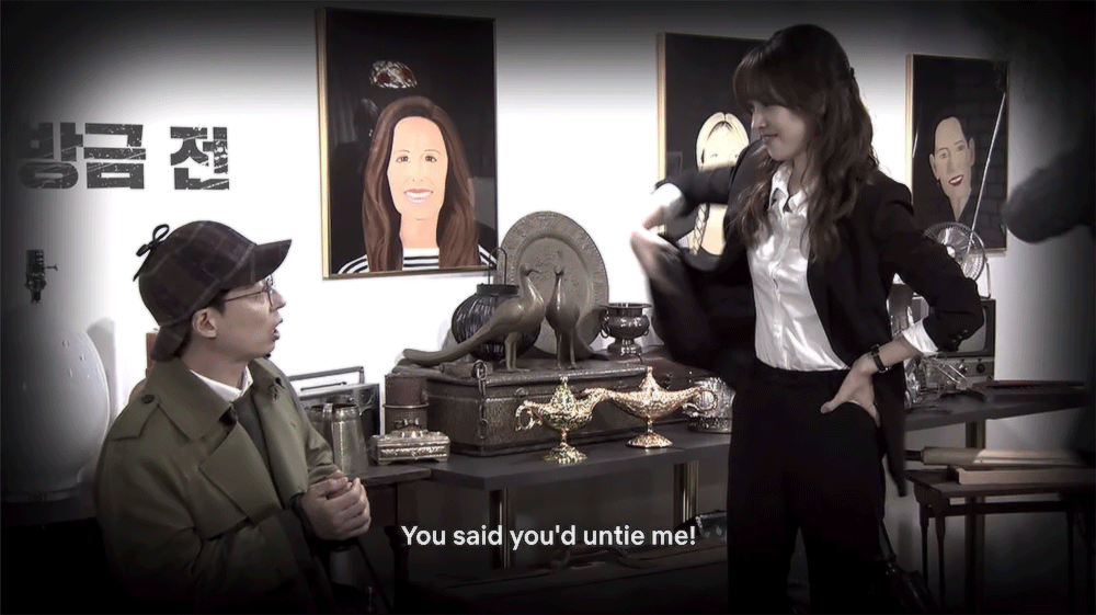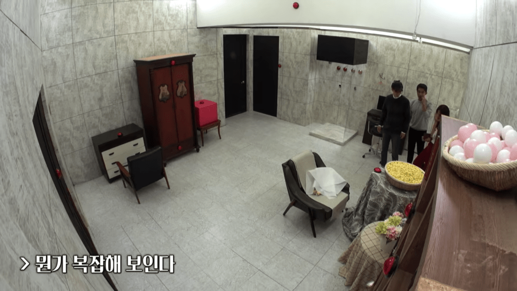 The team splits up again to check the two different places; Jaesuk, Jaewook, Sejeong, and Sungjae go to the house. Seyeon works as a secretary for the company, so she was able to infiltrate the house and deactivate security for one hour. Of course, there are still some tricks to finding the Odd Eye. The group enters the first floor to find a miscellaneous array of items and red buttons. One of the red buttons opens the doorway to the rest of the house, but most of the others have unpleasant surprises – jump scares, spraying the detectives with water or fake snow, etc. This is definitely one of those tasks that plays up the slapstick aspect of the show.