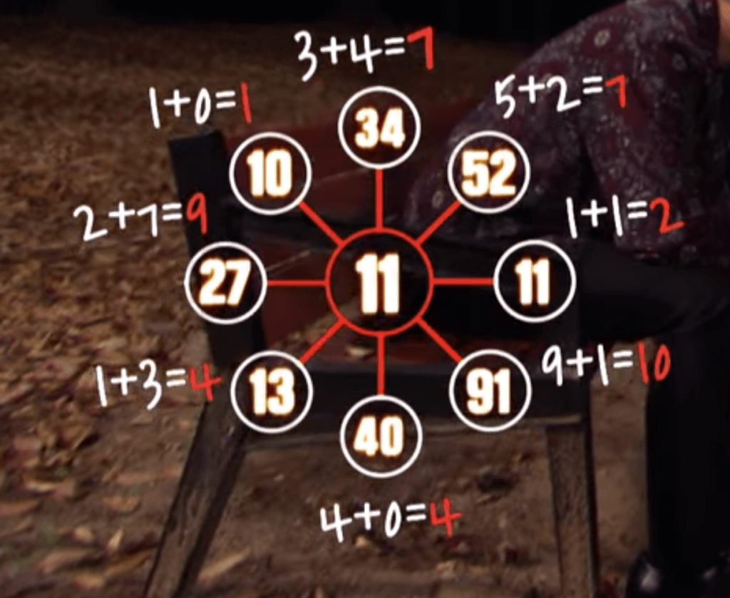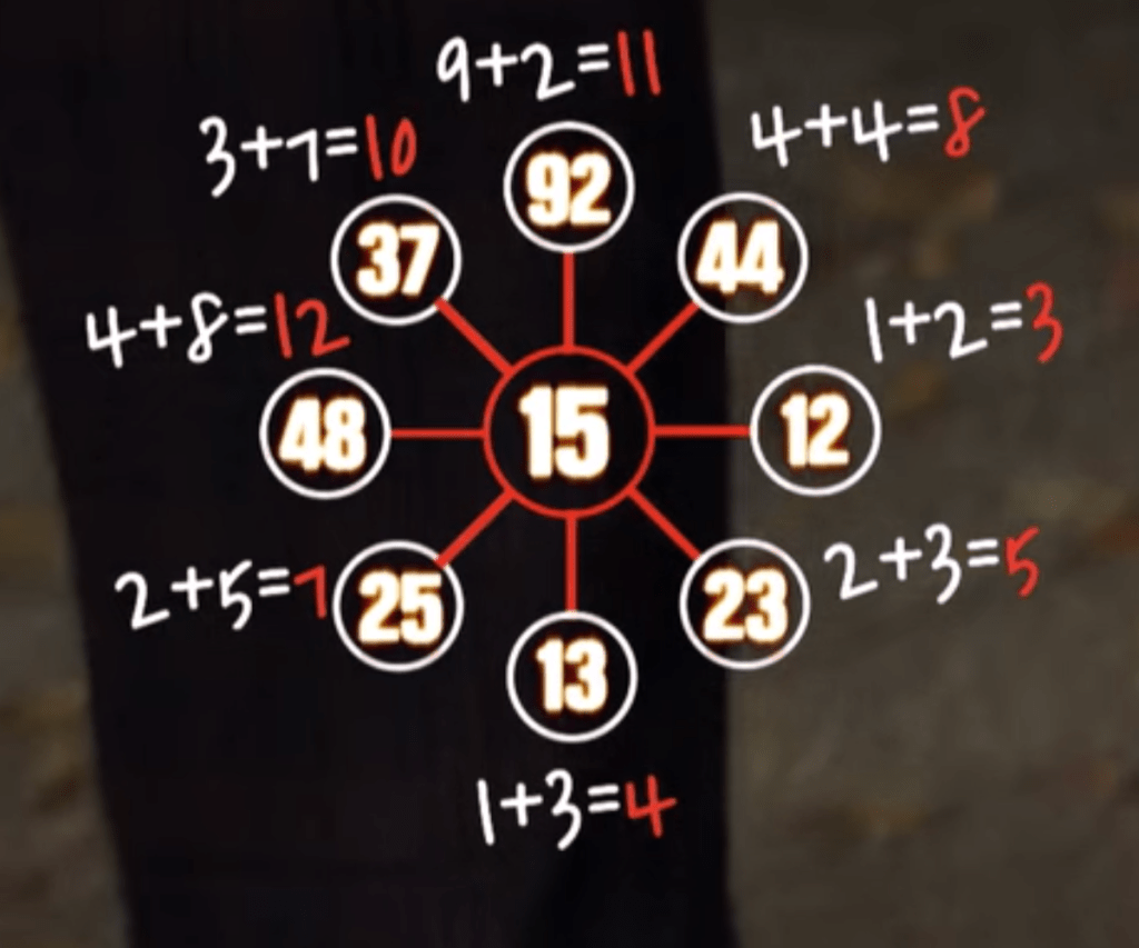 There are rings of various two digit numbers in bubbles; figuring out their pattern will determine the number that goes in the center. You have to add the two digits in each bubble together – for example, 34 would be 3+4 or 7. Then, you must add that number to the one directly across from it. So if 34 aka 7 is across from 40 aka 4, then the answer would be 11. (All the number pairs in the ring should have the same total.) Sejeong figures out the answer to one puzzle is 11 like I outlined above, and the answer to the other is 15.