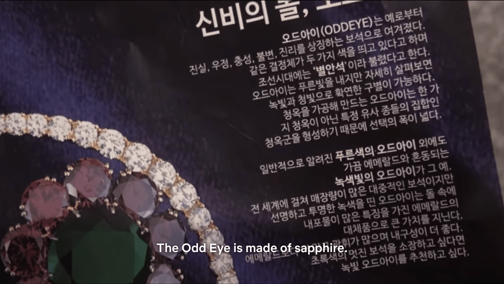 The team then receives a call from the sender of the package, aka their next client. She explains that her family owns a very special piece of jewelry – it used to be called the “Byeolanseok” (which means “starstone” according to Google Translate), but it’s now called the “Odd Eye.” It looks like a pair of mismatched eyes, one green and one blue. According to the client, the Odd Eye is in danger because a criminal called the Phantom Thief has all but declared it his next target. The clues in the package point to Changgyeonggung because that’s where the floor plans for the Odd Eye’s location are hidden. She requests that the team find those plans and bring them to her later that morning. The team agrees and takes Sungjae on as an intern for the time being.