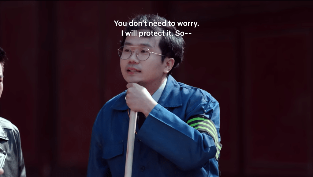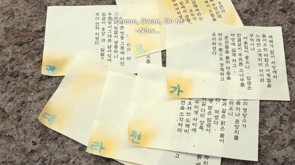 The team goes to Gwancheondae and finds a tube containing the floor plans with minutes to spare. However, security guard Sangtae shows up again and reprimands them for messing with public property. He confiscates the tube and orders them to write down their contact information, but abandons everything when he notices other palace visitors doing something he doesn’t like offscreen. The team retrieves the tube and opens it to find a blank piece of paper… looks like the floor plans got switched out at some point, most likely when they were all distracted with the guest log. That security guard is looking MIGHTY suspicious now.
