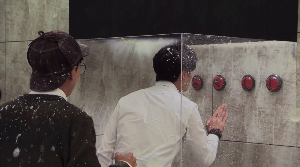 - One of the buttons looks like it will open a door, but it actually reveals a giant high-speed fan that blasts them all with gusts of wind. (Though Sungjae uses the opportunity to try and dry off.)