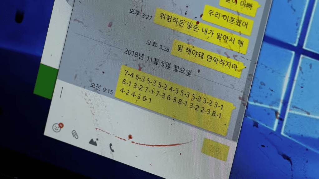 When the team figures out the code, they see a chilling message: “Sol killed me. Protect him.” Remember how there was security footage of Sol running at Dongjun and pretend stabbing him with a wooden sword? And then Dongjun saying something to him? Basically, he told him to go home and do the same thing with his mother… but with a real sword. Since Hyejin was taking an anti-coagulant, it made it easier for her to bleed out and die even from a stab wound by a kid who was just playing around. So she used her last remaining strength to text Sungwook, who came over and tried to frame Dongjun like we already knew. Then when that failed, he took the blame to protect his son.