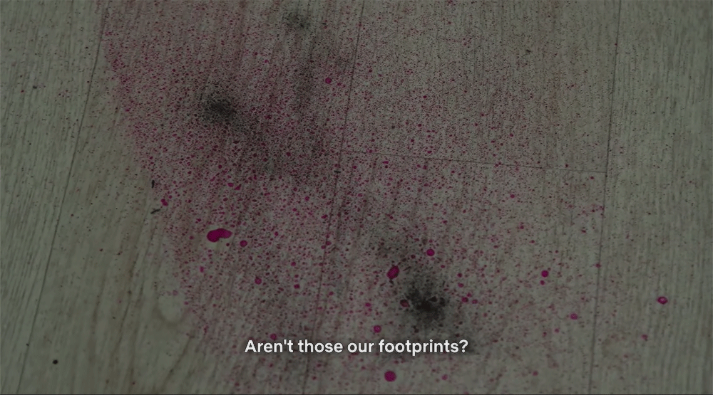 Jaewook sees a bottle of tire rim cleaner lying by the door. He starts spraying it around and sees that it makes a red/pink color in certain spots. Further spraying reveals a set of footprints leading out the back door. They follow the trail through the passageway and over to the house next door. Jaewook takes Sehun and Sejeong back to the victim’s house to wait for Sungwook. While they do so, they find a container of metal powder and figure out that’s what the spray is reacting to. Sungwook then shows up and is understandably distraught over seeing his ex-wife dead. In a somewhat bemusing moment, Jaewook sprays his shoes to check for metal powder while the guy is mourning and kneeling over her body… there’s a time and a place, man!