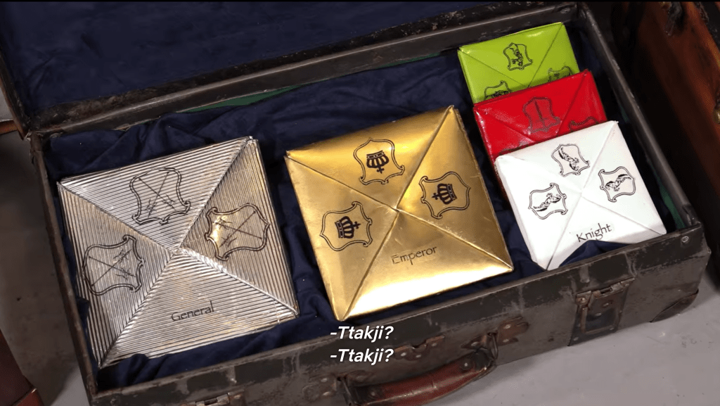 This encounter’s traditional Korean game is ttakji. Basically, it’s a game played with folded paper tiles. Your opponent places theirs on the floor, and you have to hit it with yours using enough force to flip it over. Tae Hangho provides the group with different sized ttajki; theirs all range from super small to medium (“Citizen,” “Knight,” “Soldier,” “General”), while his is giant (“Emperor”). Of course. Each detective plays a one on one round with Tae Hangho, starting from the smallest sized ttakji. Whoever flips the opponent’s ttakji first wins the round, so Tae Hangho can confiscate theirs if he wins. But if any one of them succeeds in flipping his, the game ends there.