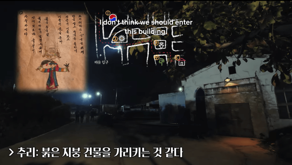Jaesuk and Jaemin found a key and some scrolls at the shrine, and they show them to the team. Each page has a cryptic passage that points to a specific location in the village. For example, one says, “Make rice cake and alcohol with freshly harvested grains. Then the gods will emit the white scent of chrysanthemums.” This is a reference about a flower mural that they passed earlier in the episode. The team goes through the pages and looks for each spot together. They come to a fork in the road, so they split up into groups and go in both directions. Jongmin, Seunggi, Sehun, and Sejeong end up taking the correct path, because they manage to find the girls at the last location the pages indicate – whichis a scary rundown looking building, because of course.