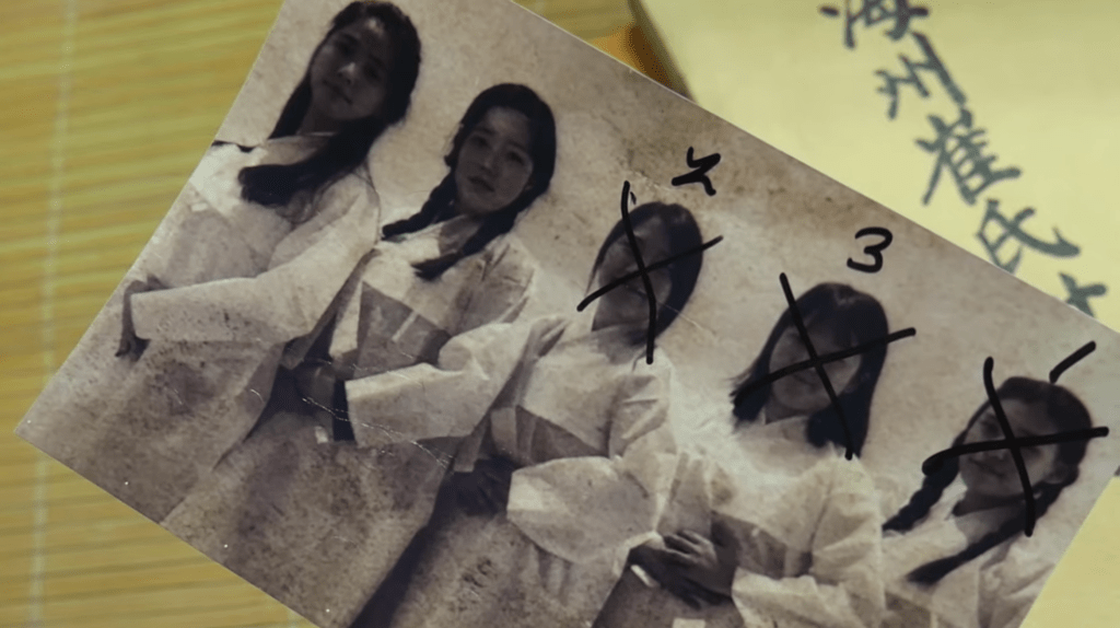 When they go into Hyewon’s room, they find her journal and find a picture of a girl with a man. She seems to be one of the girls in the photo they previously found. Note that the team thinks this girl is Hyewon, but I’m not so sure. (I will elaborate on this later.) Hyewon’s journal says: “Today, some women said something strange at the well. I didn’t get the first name, but the last name was Park. They said it began when Mr. Park came here. Apparently, that man and a shaman in our village fell in love with each other. But exactly what began? And who did that man fall in love with?” They surmise that the man in the photo is Mr. Park. When they turn the photo over, it says, “The village was ruined because of him.”