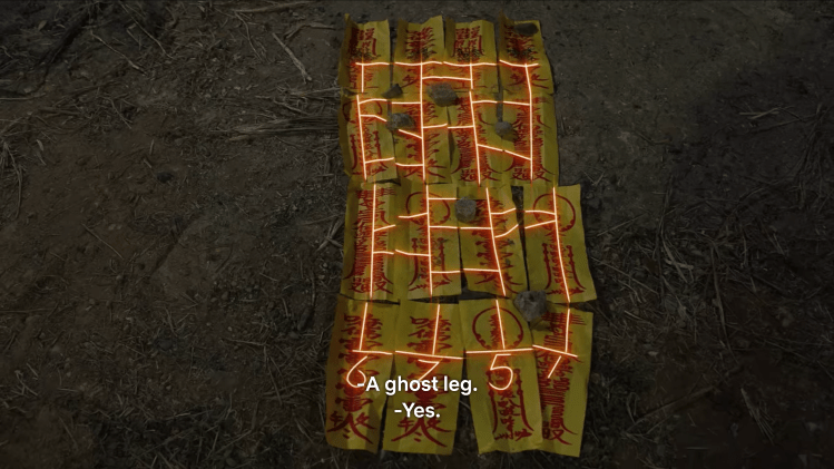 Meanwhile, Jaesuk, Jaewook, and Minyoung happen upon the the crematory at the end of the second path. It’s locked by some mechanism of four buttons, with each button representing a different animal. Jaesuk glances through the window and and sees a man tied up inside. (His face is covered with a sheet, so we don’t know his identity yet.) To unlock the door, they have to take down the nearby hanging talismans and put them together like a puzzle. When properly assembled, they show a version of the ladder game – or as they call it , the ghost leg. So they must follow the trail for each animal to see how many times to press its respective button.