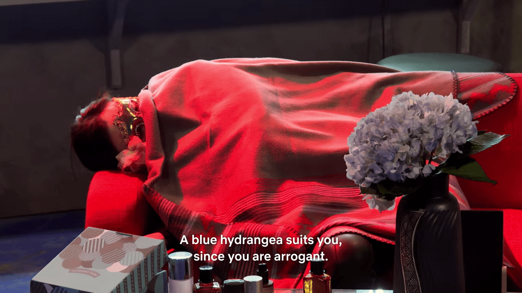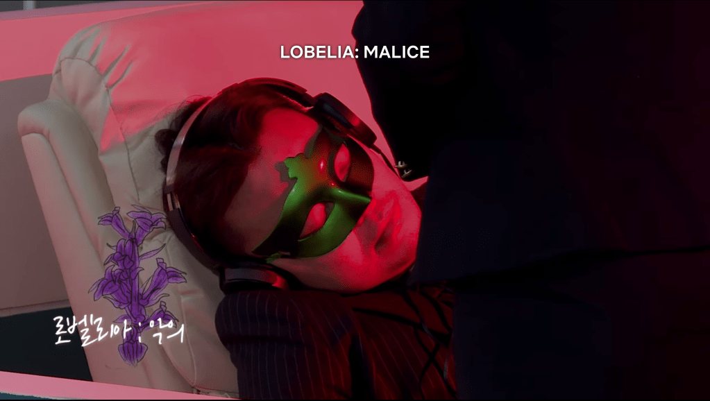 “Tae Hangho” delivers the headphones to the Flower Killer, who gives them to his flight attendant acolyte in turn. She’s working on a flight that the CEO is on, and she switches out his headphones for the tasered ones. When he puts them on, he electrocutes himself to death. She then leaves a picture of a purple flower and says, “Your bad deeds led to so many victims. It’s time for you to be the victim instead, with this lobelia on you.” Lobelia represents malice.