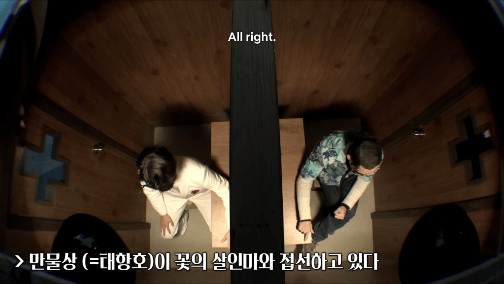 This is one of the main revelations of the play, and I believe the episode is actually specifically edited to help us discover this important plot point more than anything else. But since I rearranged the recap, I now lack a logical place to put it… so I’ll just mention it first. We’ve known pretty much from the beginning that Tae Hangho is a criminal and has done some shady stuff. This play essentially confirms that not only does he know the Flower Killer, he’s one of his accomplices. In fact, he’s probably his main accomplice. For almost all of the killings, we see scenes of the Flower Killer contacting “Tae Hangho” and requesting various items to help with the murder. (Remember that the Flower Killer notoriously doesn’t leave bloody bodies, so he must resort to more creative methods.) “Tae Hangho” then goes to see Poison and his assistant and acts as the middle man to commission whatever the Flower Killer wants. There are several instances where the Flower Killer and “Tae Hangho” regularly meet at a Catholic church and communicate through a confessional; “Tae Hangho” also leaves items in a chest there for the Flower Killer to pick up.