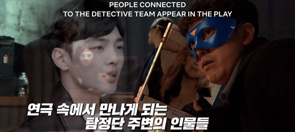 One other thing: I mentioned before that acquaintances of the team appear as characters in the play. But because nothing is ever easy, some of the *actual* people show up during the play as well. For example, I just mentioned how the team found Tae Hangho dead on set before the play started. However, someone is still acting as him in the play. Confusing, right? To try and clear things up, I’ll be referring to characters in the play with quotation marks around their names. For example, if I write “Tae Hangho,” I mean the actor portraying him in the play. If I write his name as I normally do, I mean the actual character whom we’ve seen over the course of the season. (I hope this makes sense.)