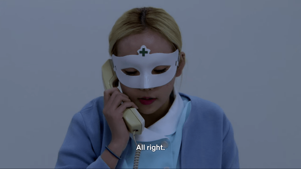 Meanwhile, Sehun checks out a space that’s labeled as the “cult church.” We see two women doing some more interpretive dancing: one is a blonde whose white mask has a hospital logo, and one is black haired and has a blue mask with an airplane logo. This part focuses on the latter, but remember the other one for later. The woman in the blue mask heads behind a screen and changes into a flight attendant uniform.