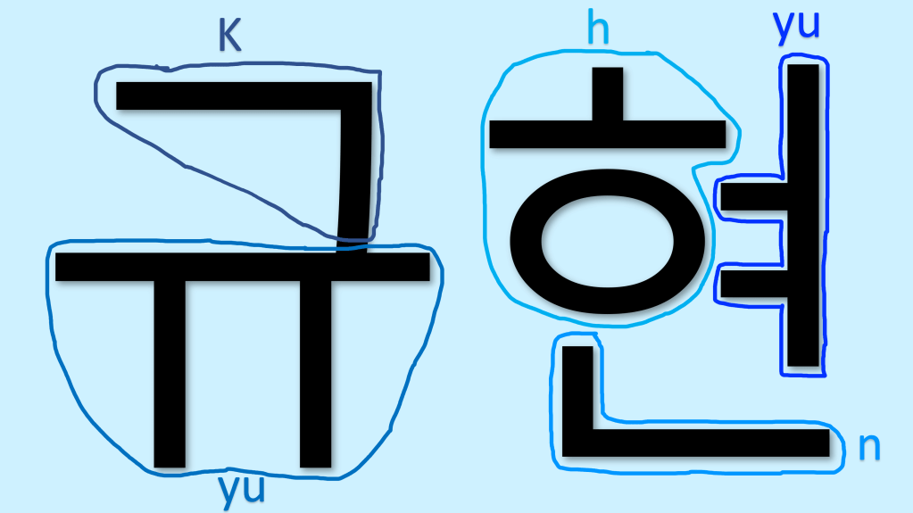 - The first letter in Kyuhyun’s name is “ㄱ,” which is typically pronounced somewhere between a “g” and a “k.” However, I personally think this is one of those words where the “ㄱ” always sounds like a “k.” The other examples I often reference are “taekwondo” and “kimchi.” Even though the English textbooks I use spell them with “g” (because of Revised Romanization), every Korean I’ve ever met pronounces them with “k.”