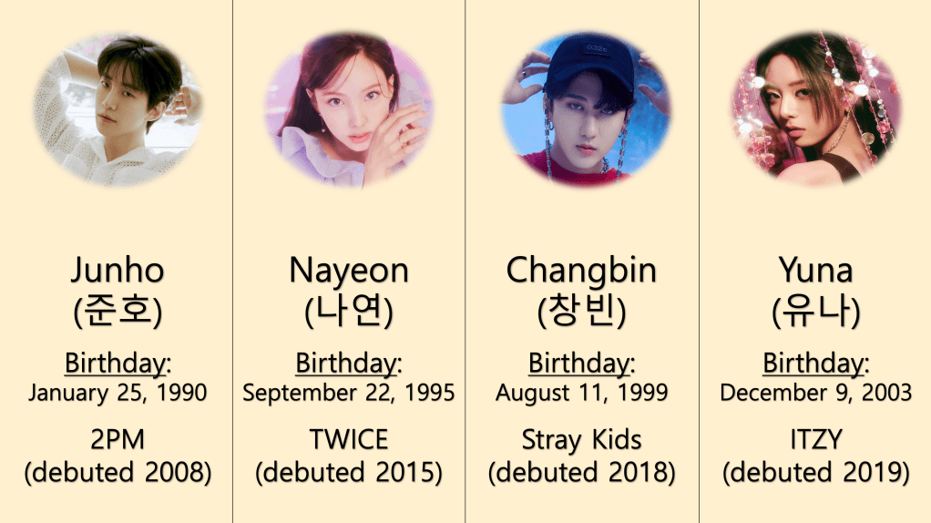 Since this is a K-pop blog, I’ve made additional charts further explaining these titles with JYP Entertainment artists. Since seniority and debut years are an added factor when it comes to how K-pop idols address each other, I included one idol from each of the agency’s active groups – which all debuted in different years. Here are the idols I chose: